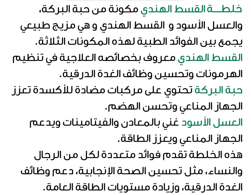 خلطة العسل الأسود بالقسط الهندي وحبة البركة هي مزيج طبيعي يعالج العديد من الامراض وهذا بفضل خصائصه الغنية بالمغذيات والمضادات الطبيعية.